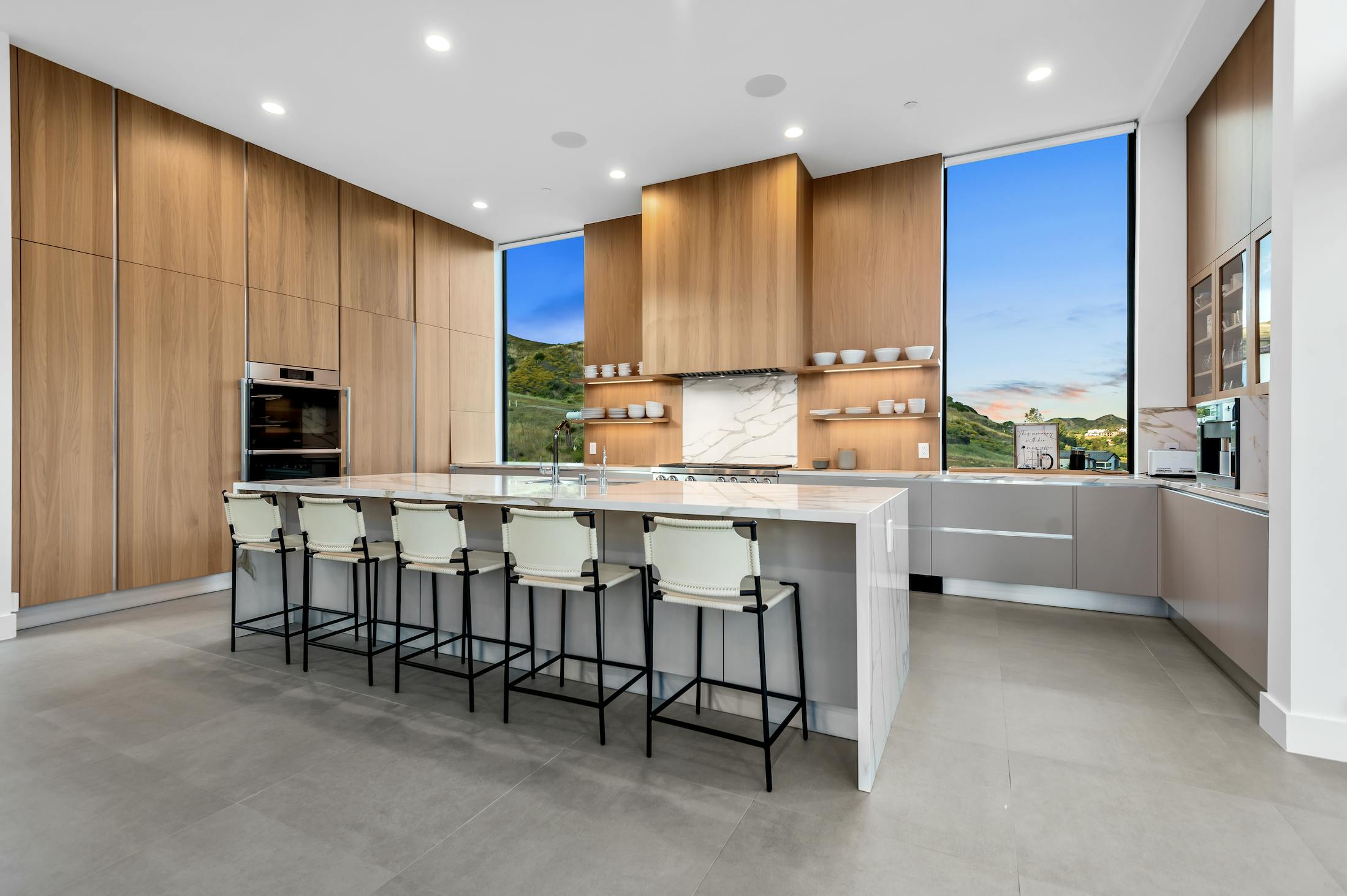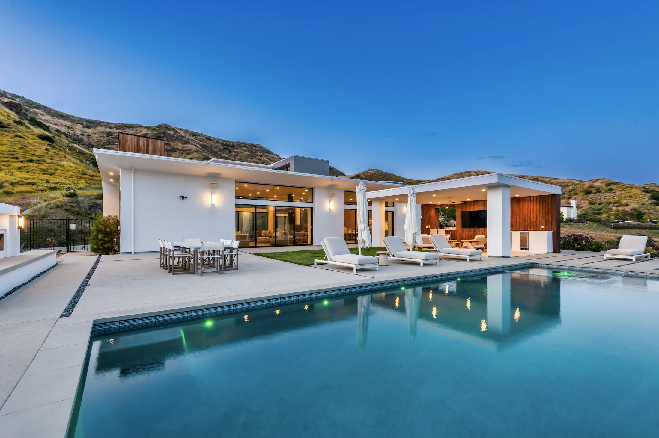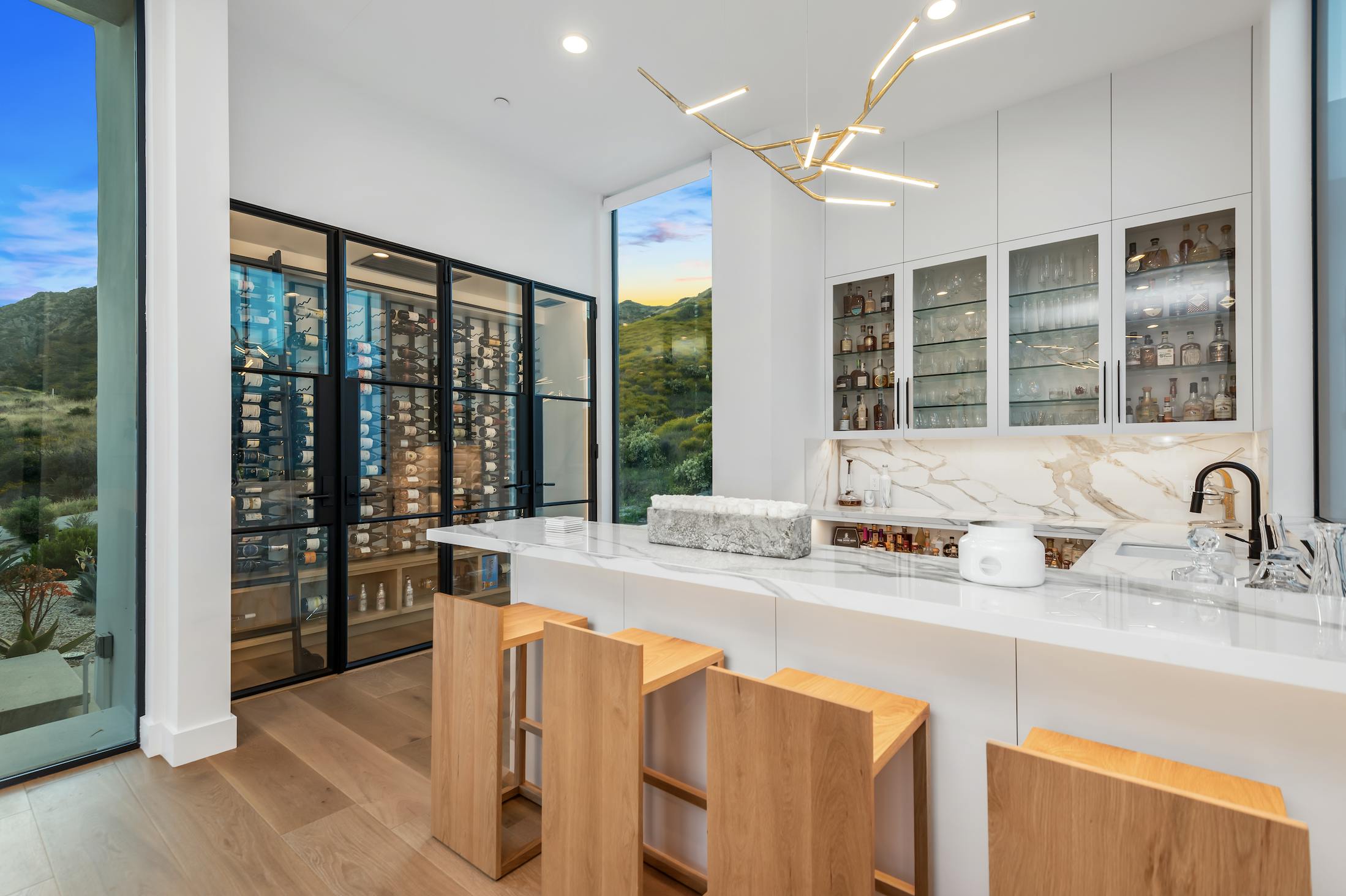 Built in 2020, the secluded, contemporary home features an open concept floor plan, which allows for panoramic views of mountainous Lobo Canyon from a plethora of oversized windows. Inside, the house includes four bedrooms, four spa-like bathrooms, a grand floating staircase, a sprawling kitchen, a wine wall, and high-end finishes throughout.