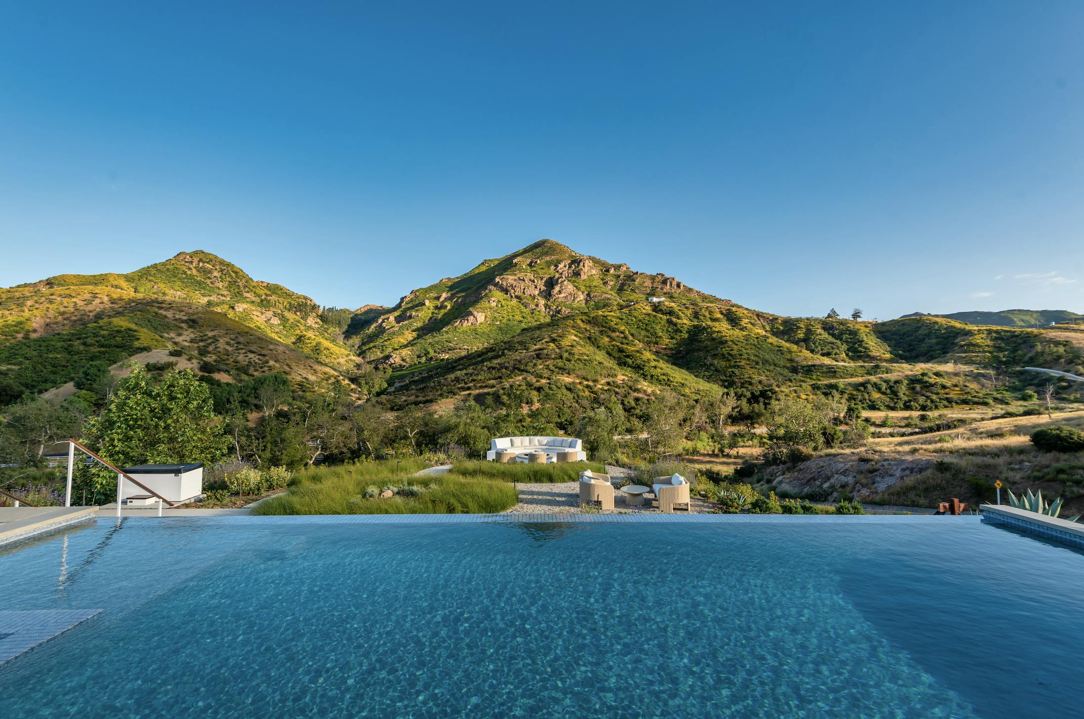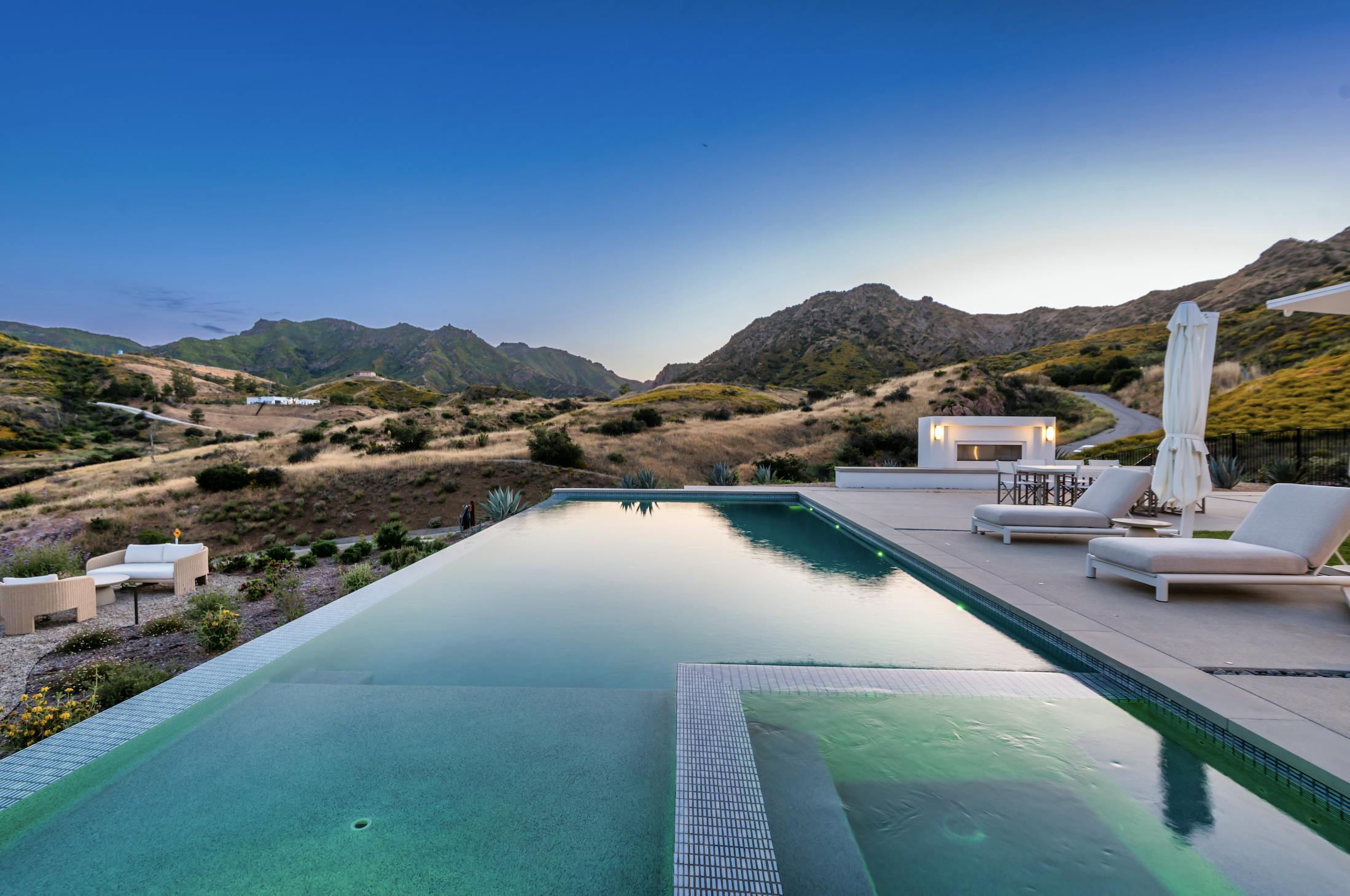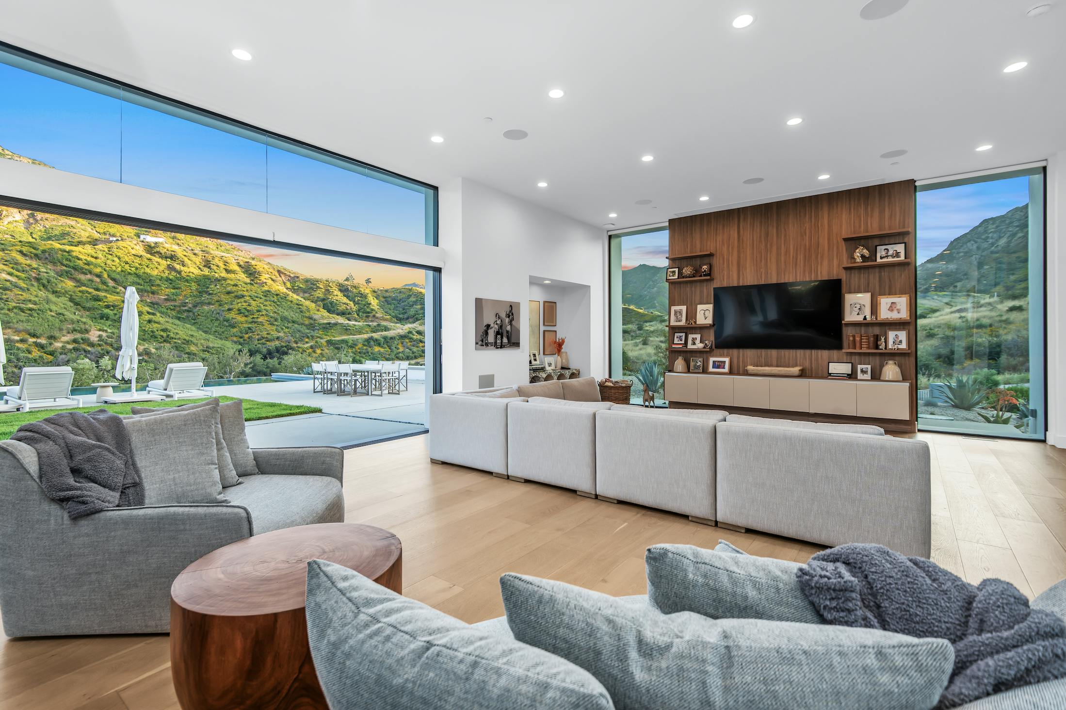 Built in 2020, the secluded, contemporary home features an open concept floor plan, which allows for panoramic views of mountainous Lobo Canyon from a plethora of oversized windows. Inside, the house includes four bedrooms, four spa-like bathrooms, a grand floating staircase, a sprawling kitchen, a wine wall, and high-end finishes throughout.