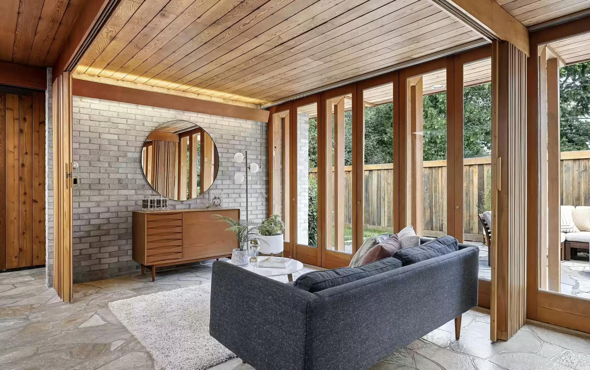 With architecture inspired by Frank Lloyd Wright, the over 2,000 square-foot home boasts a minimalist design with plentiful natural wood, stone flooring, and a total of 54 French windows for optimal lighting. At the heart of the residence lies a spa-like indoor geothermal/mineral swimming pool.