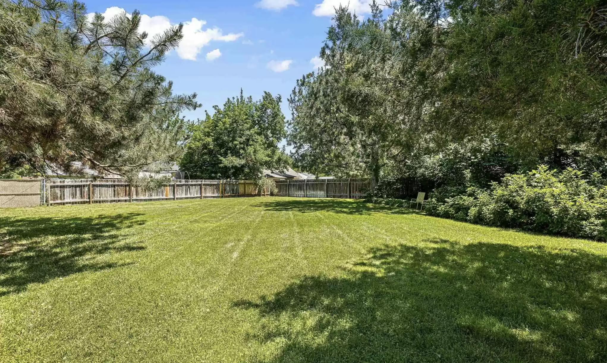 The home’s exterior features a patio perfect for relaxing or entertaining – and a spacious grassy yard surrounded by evergreen trees.