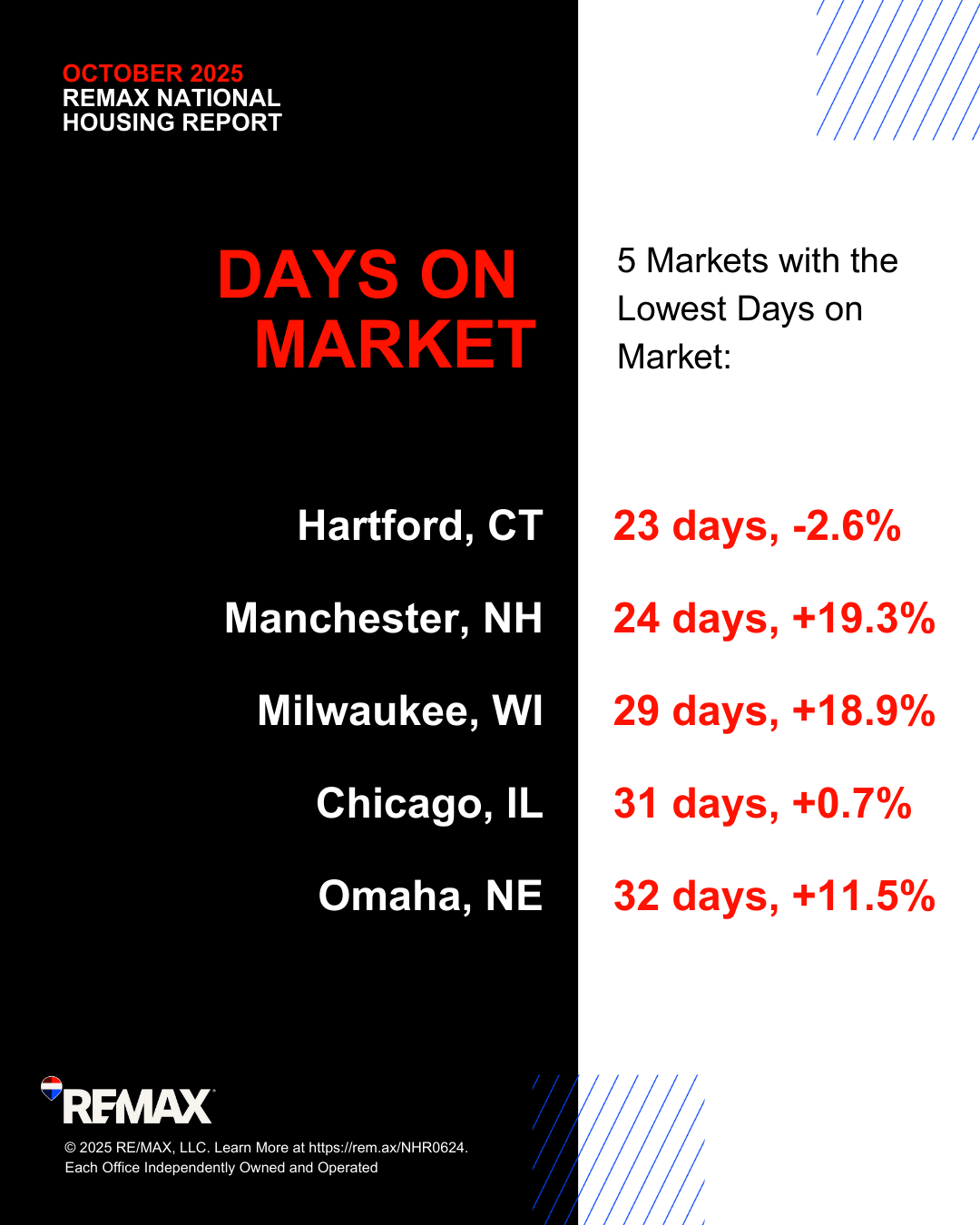 The most recent REMAX National Housing Report offers overarching insights into October's real estate landscape. One metric, however, stood out for both buyers and sellers: Days on Market (DOM). This number shows how quickly homes are selling – and what that speed means for strategy.