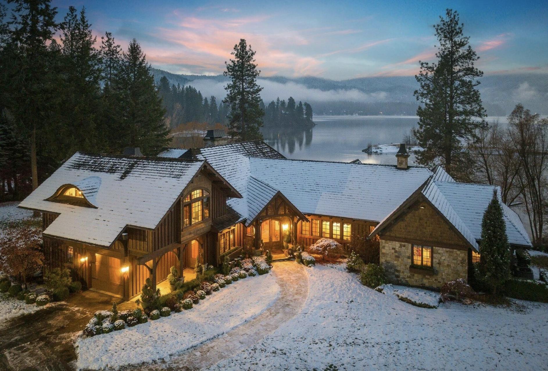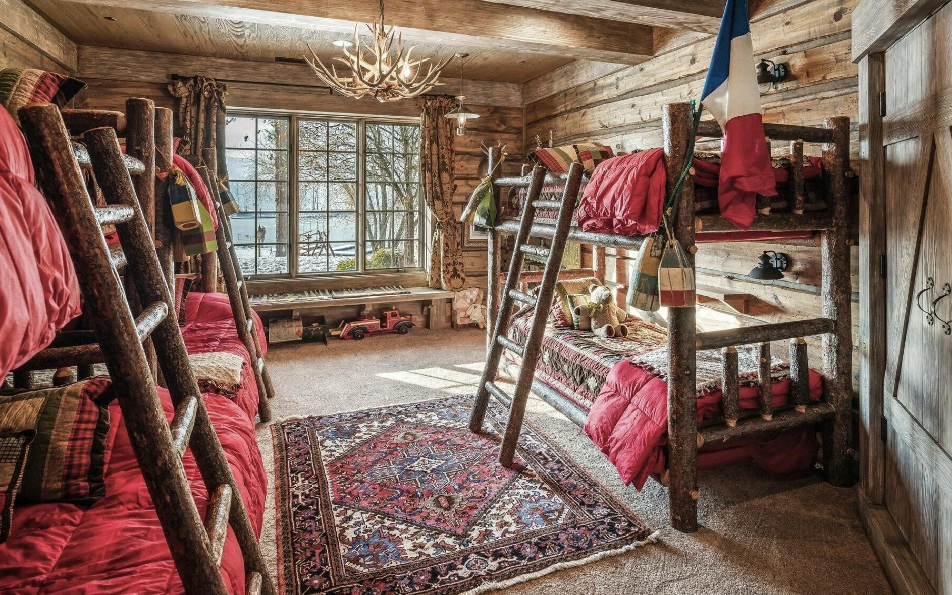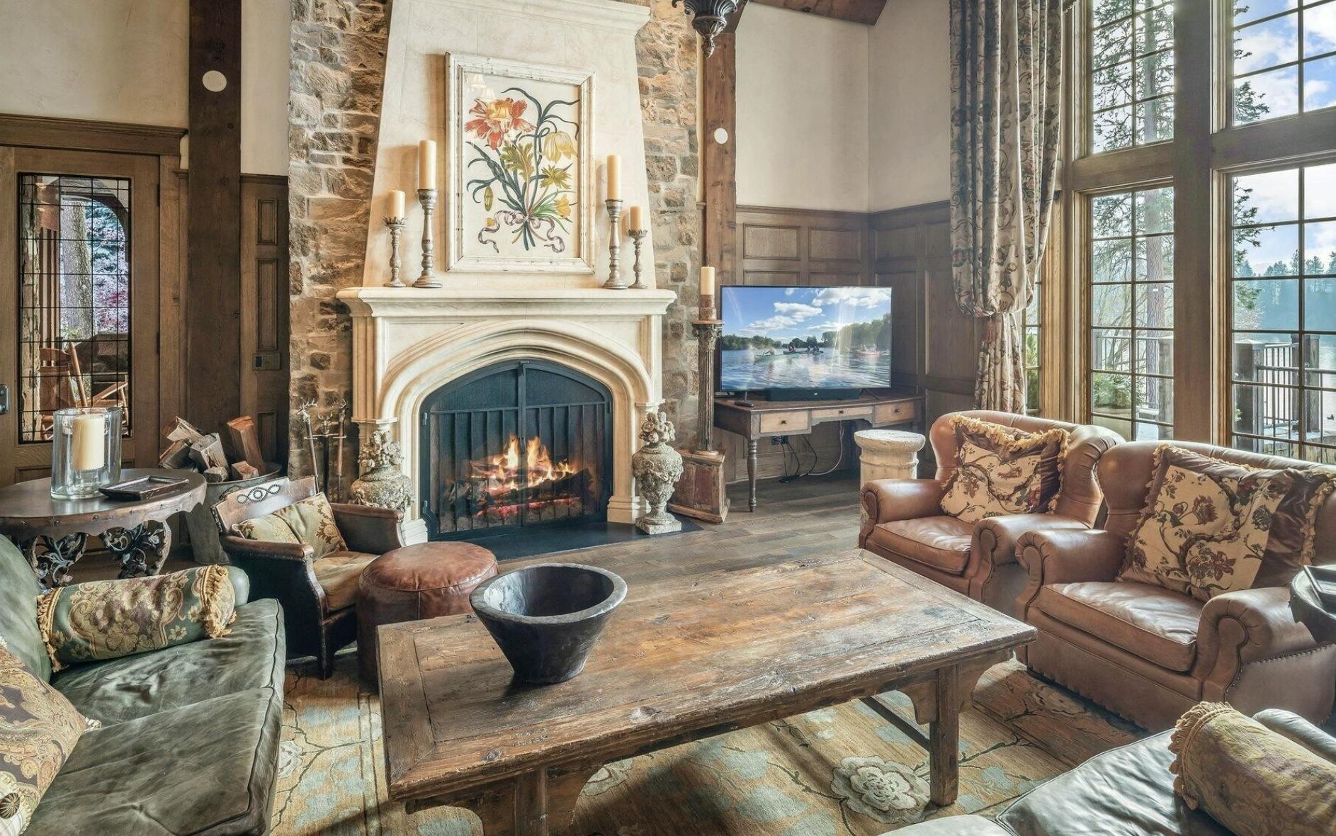 Details: Set on nearly six acres of land, this luxury lakefront estate offers tranquility year-round. With intricate detail throughout, the 5-bed, 7-bath home features a chef’s kitchen, a grand rock fireplace in the main living room, designated outdoor entertainment space, private guest quarters, and more. In the summertime, enjoy 420 feet of private sandy beach, complete with a dock for boat parking.