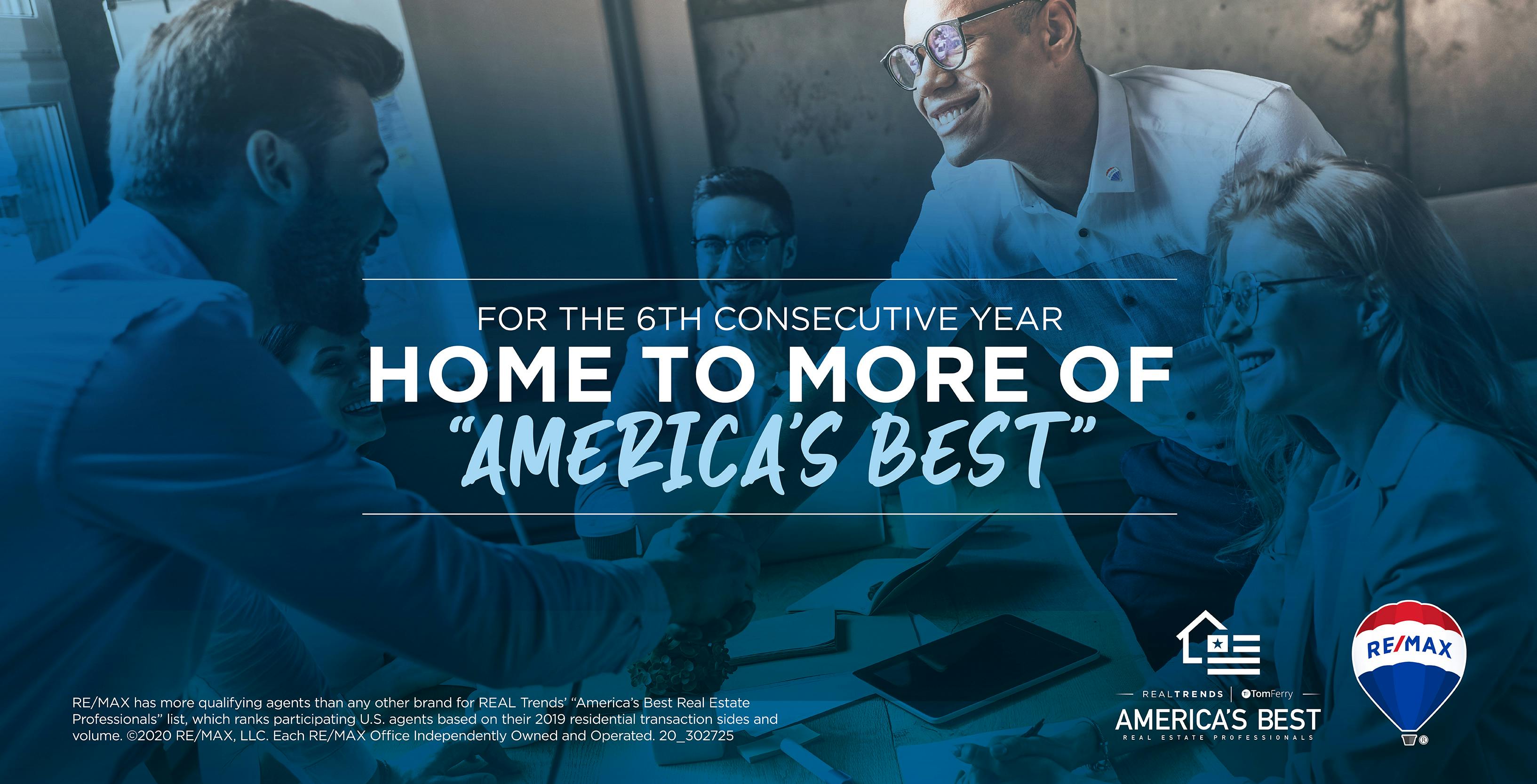 For the sixth consecutive year, RE/MAX placed more agents and teams than any other brand in the “America’s Best Real Estate Professionals” rankings. In this year’s survey, 1 in 5, or 20%, of “America’s Best” are RE/MAX agents and teams.