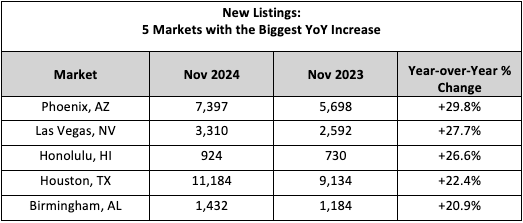 In the 50 metro markets surveyed, November inventory was 25.0% higher year over year but declined 4.3% from October. New listings also increased and were 8.5% higher year over year but dropped 23.5% month over month.