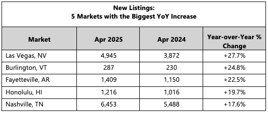 In the 51 metro areas surveyed, the number of newly listed homes in April 2025 was up 7.5% compared to April 2024, and up 6.2% compared to March 2025. The markets with the biggest increase in year-over-year new listings percentage were Las Vegas, NV at +27.7%, Burlington, VT at +24.8%, and Fayetteville, AR at +22.5%. The markets with the biggest year-over-year decrease in new listings percentage were St. Louis, MO at -17.2%, Anchorage, AK at -8.4%, and Kansas City, MO at -7.8%.