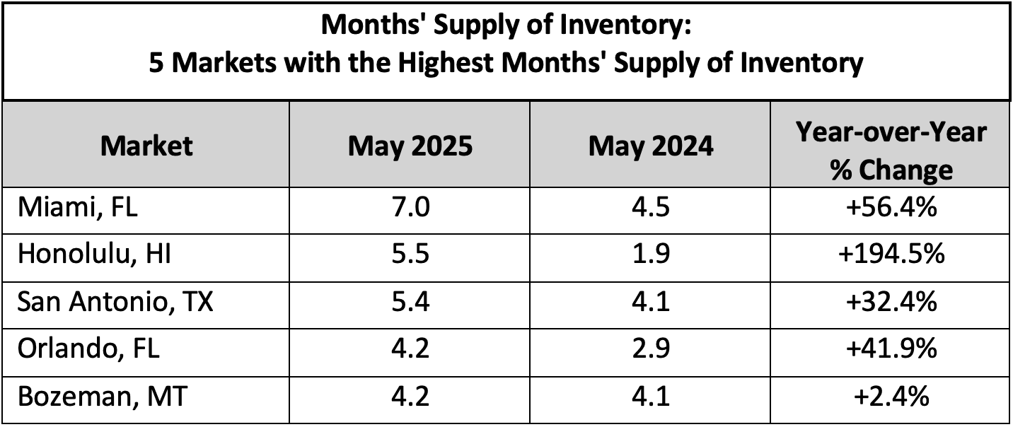 The number of homes for sale in May 2025 was up 34.8% from May 2024, and up 8.3% from April 2025. Based on the rate of home sales in March 2025, the months’ supply of inventory was 2.5, up from 1.9 from May 2024, and up from 2.4 from April 2025. In April 2025, the markets with the highest months’ supply of inventory were Miami, FL at 7.0, Honolulu, HI at 5.5 and San Antonio, TX at 5.4. The markets with the lowest months’ supply of inventory were Hartford CT at 0.9, Manchester, NH and Milwaukee, WI tied at 1.0, and Baltimore, MD, Trenton, NJ, Cincinnati, OH, and Philadelphia, PA tied at 1.1.