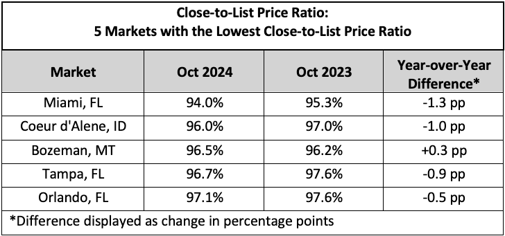 In October 2024, the average close-to-list price ratio of all 52 metro areas in the report was 99%, the same as in both September 2024 and October 2023. The close-to-list price ratio is calculated by the average value of the sales price divided by the list price for each transaction. When the number is above 100%, the home closed for more than the list price. If it’s less than 100%, the home sold for less than the list price. The metro areas with the lowest close-to-list price ratio were Miami, FL at 94.0%, Coeur d’Alene, ID at 96.0% and Bozeman, MT at 96.5%. The metro areas with the highest close-to-list price ratios were San Francisco, CA at 103.5%, Hartford, CT at 102.3%, and Trenton, NJ at 102.1%.