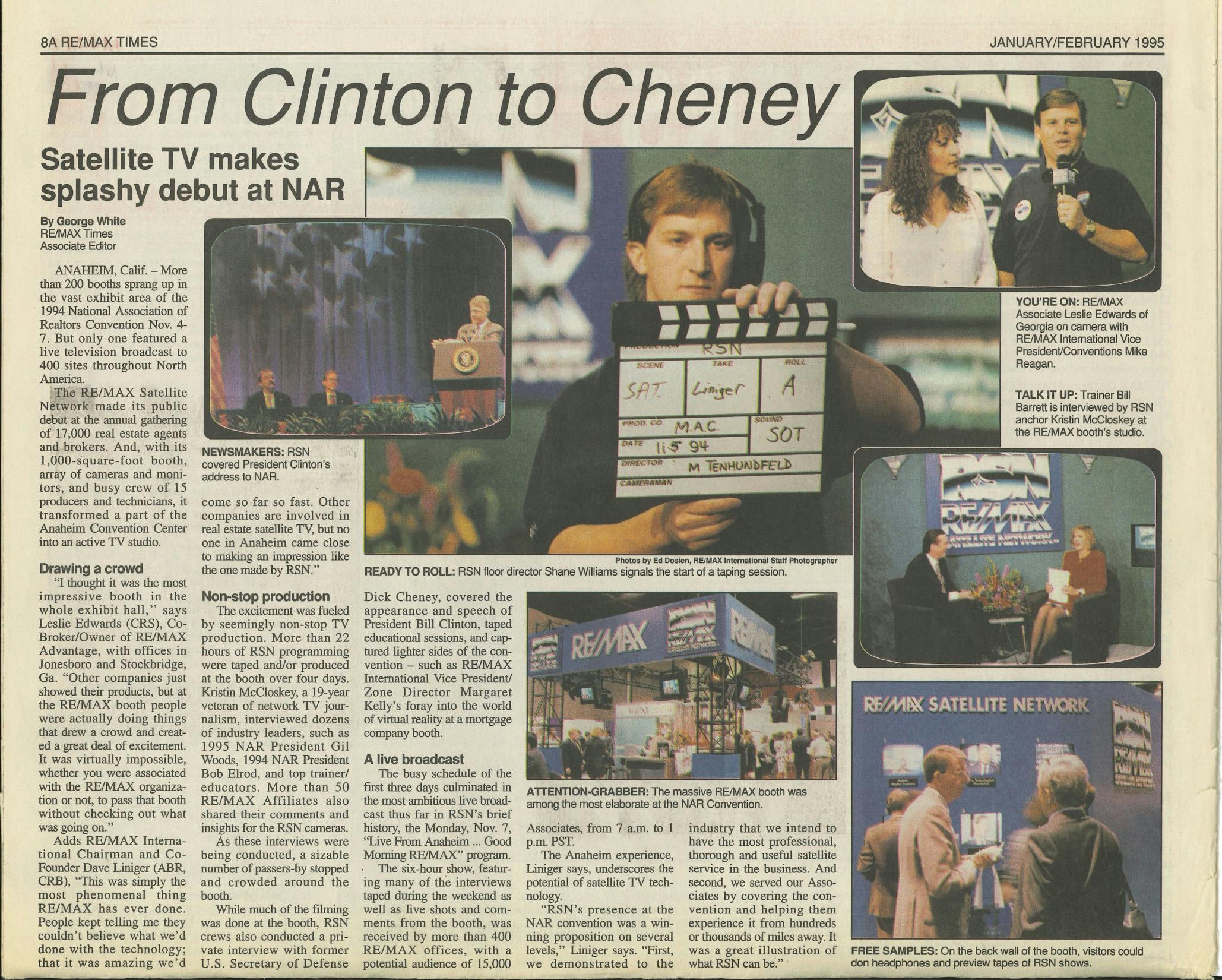 RU’s predecessor, the RE/MAX Satellite Network (RSN) debuted with a bang at the National Association of Realtors convention in November 1994. Throughout the three-day trade show in Anaheim, California, crowds gathered around the RE/MAX booth, mesmerized by what was essentially a TV studio in full production mode. Industry leaders sat down for interviews, a news team spoke to onlookers, and an army of technicians recorded everything on state-of-the-art TV equipment.