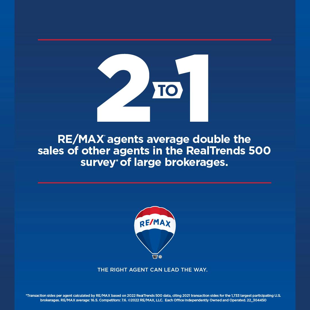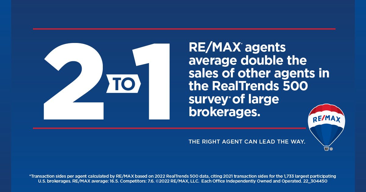 When it comes to selling homes, RE/MAX agents stay busy. For the twelfth straight year, RE/MAX agents at large U.S. brokerages outsold competitors by 2-to-1 in the previous year, according to the 2022 Real Trends 500 survey.