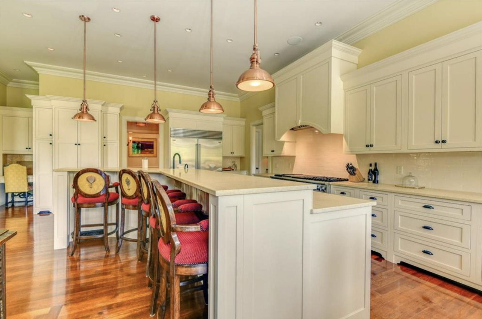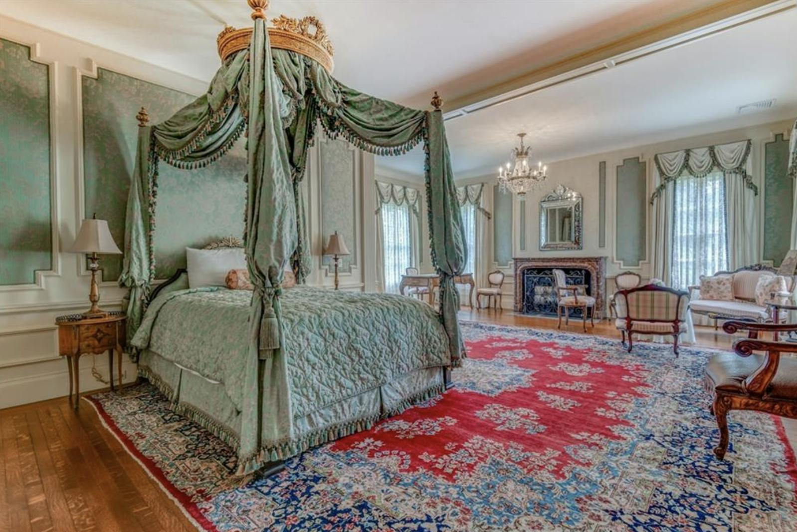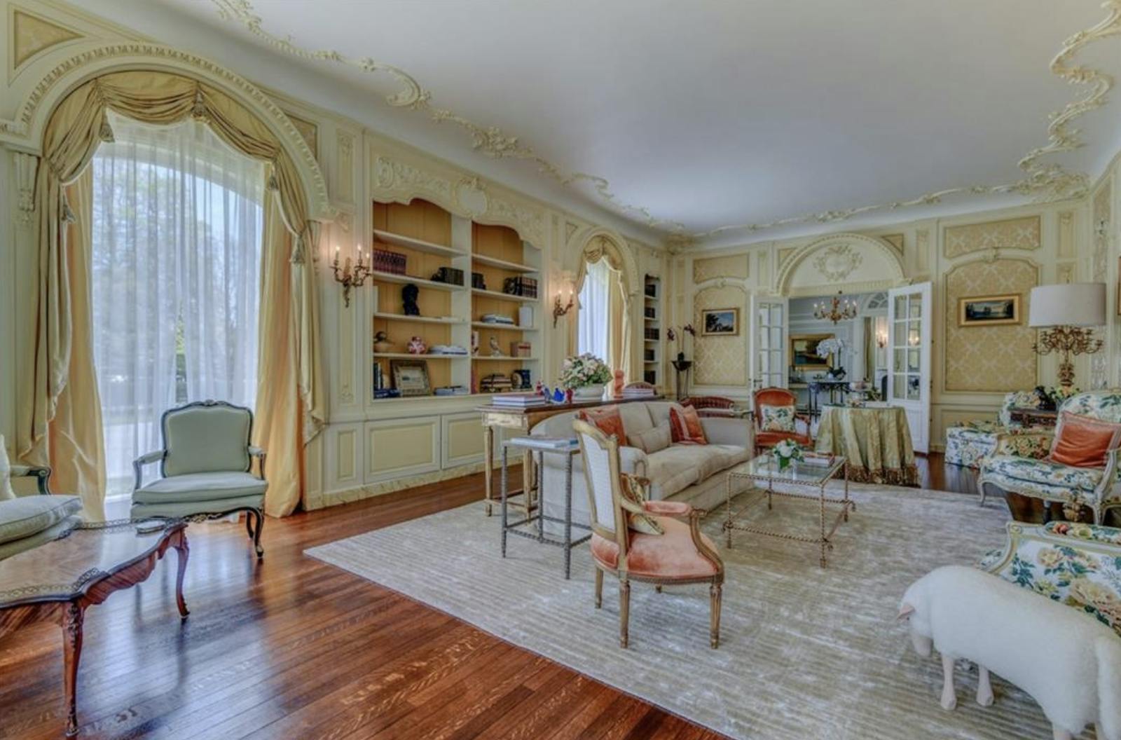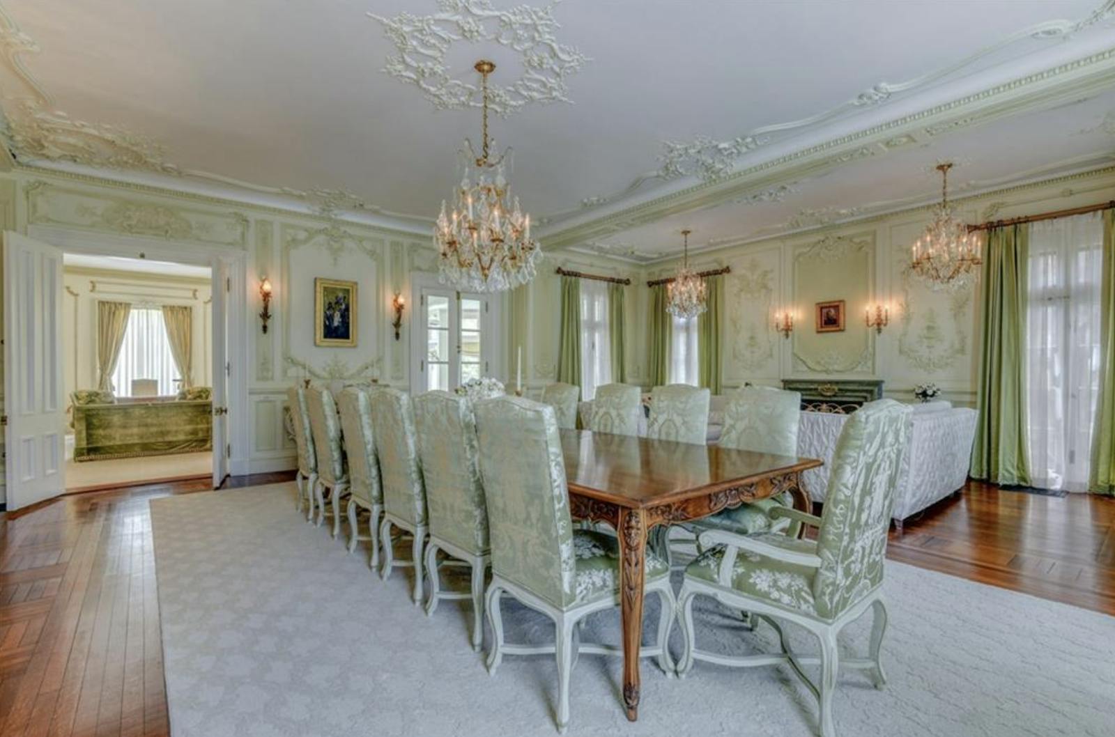 The nine-bedroom, seven-bathroom estate is complete with a formal living room, formal dining room, library, solarium, elevator, and a carriage house for guests. At the heart of the home lies a spacious renovated kitchen and great room with French doors leading outside.