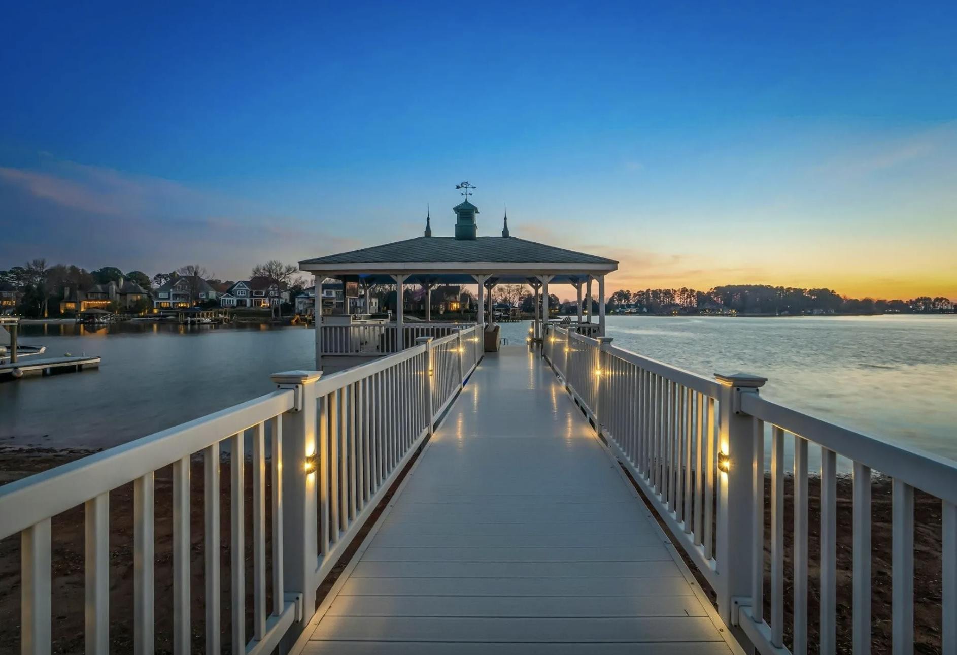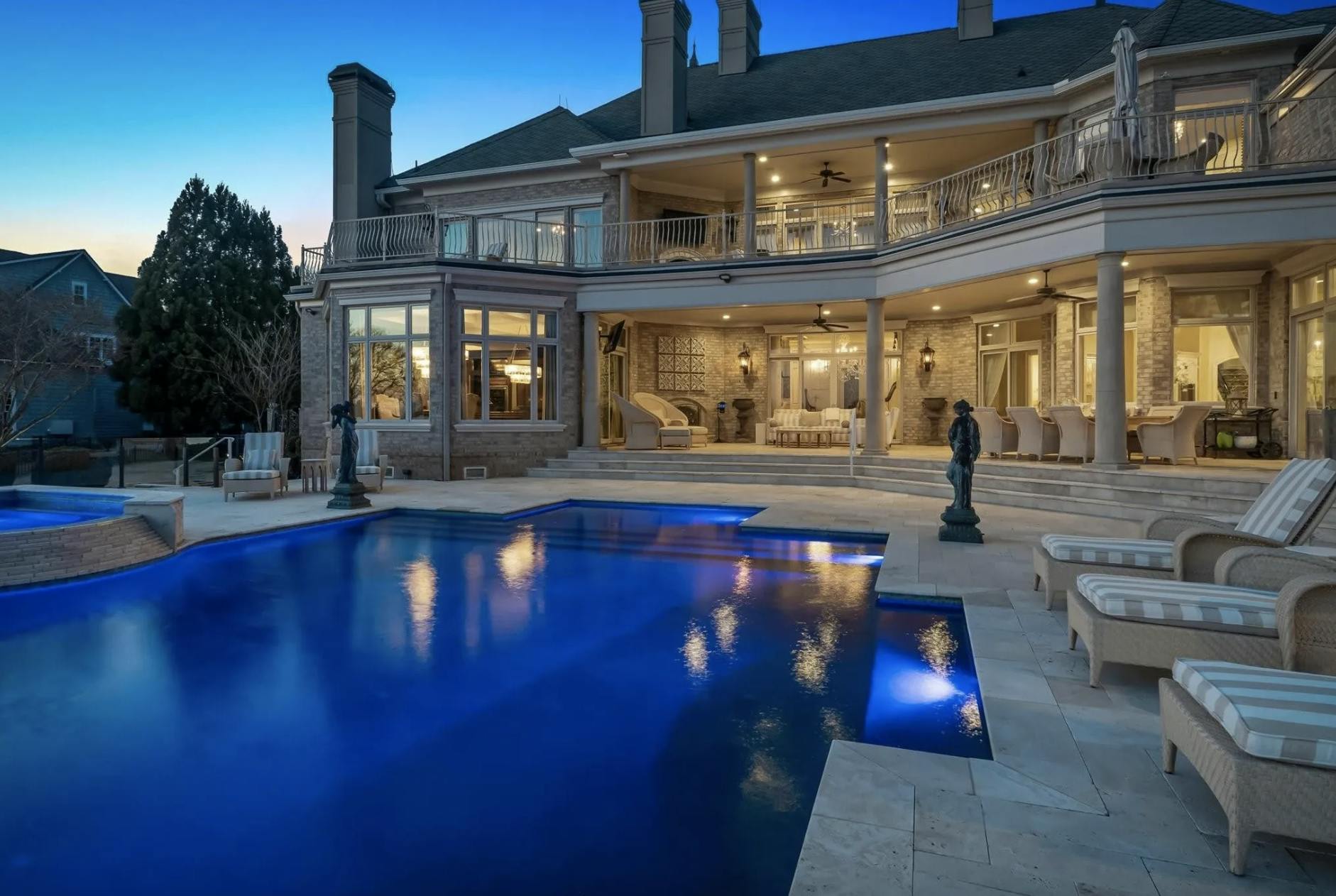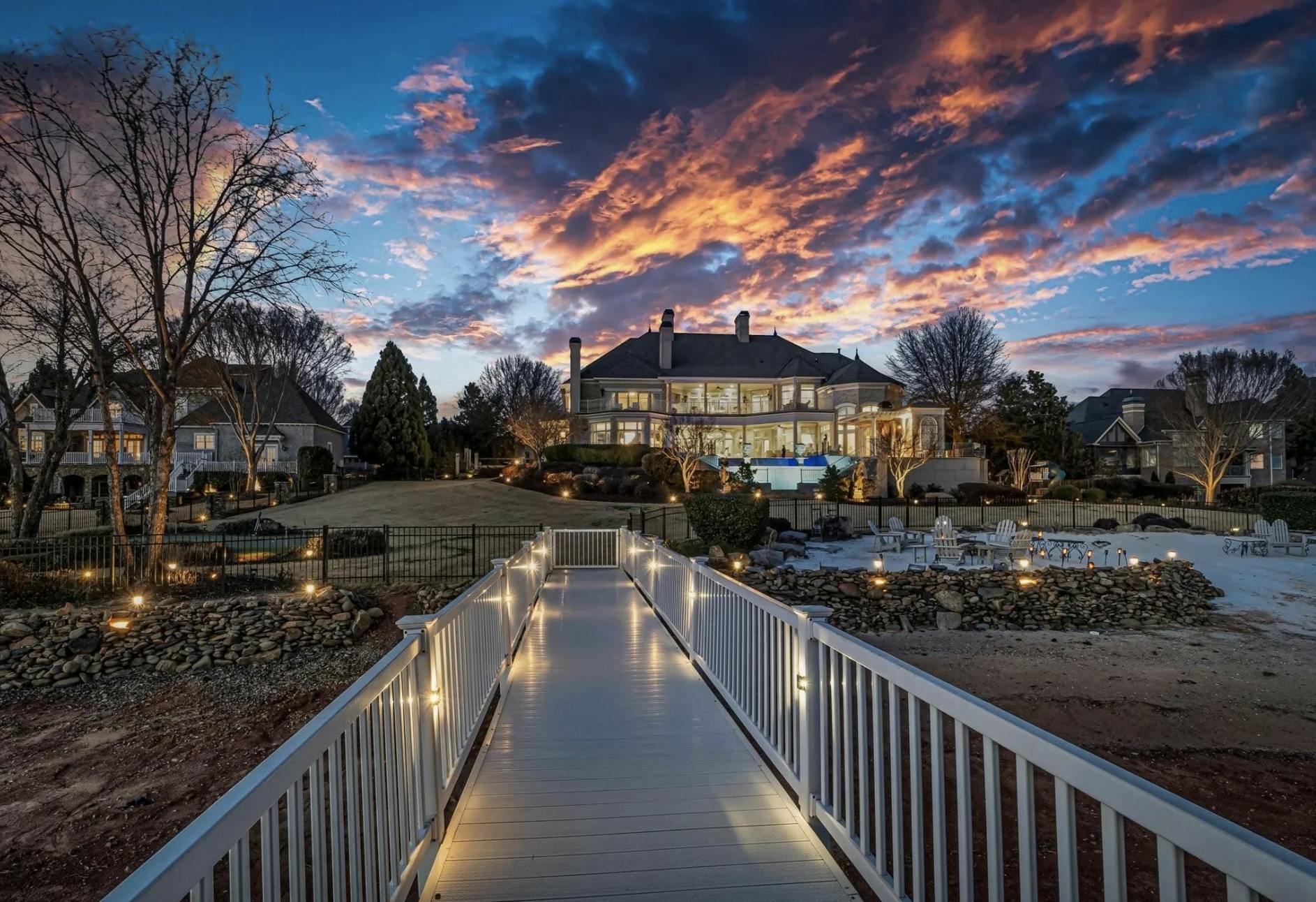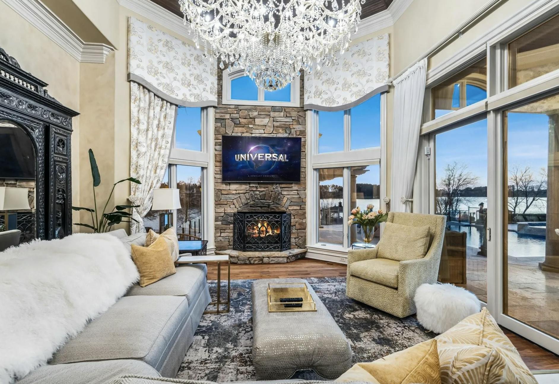 Outside, the property boasts an infinity pool, a hot tub, two docks, a boat lift, and a covered lakeside outdoor bar. With its indoor and outdoor entertainment hubs, the home makes for the perfect summertime retreat.
