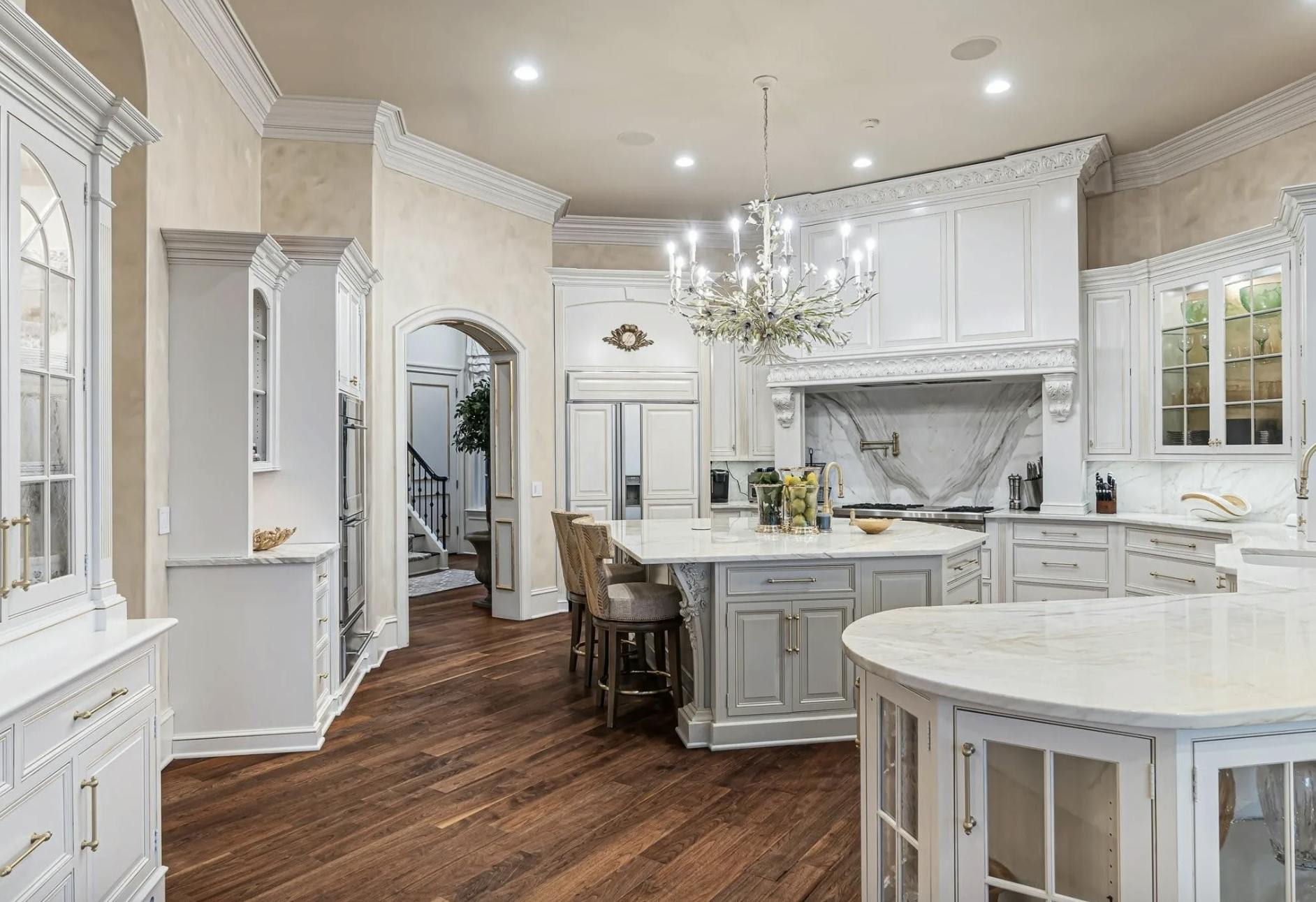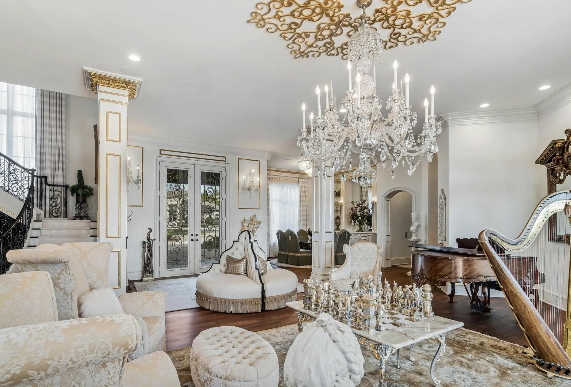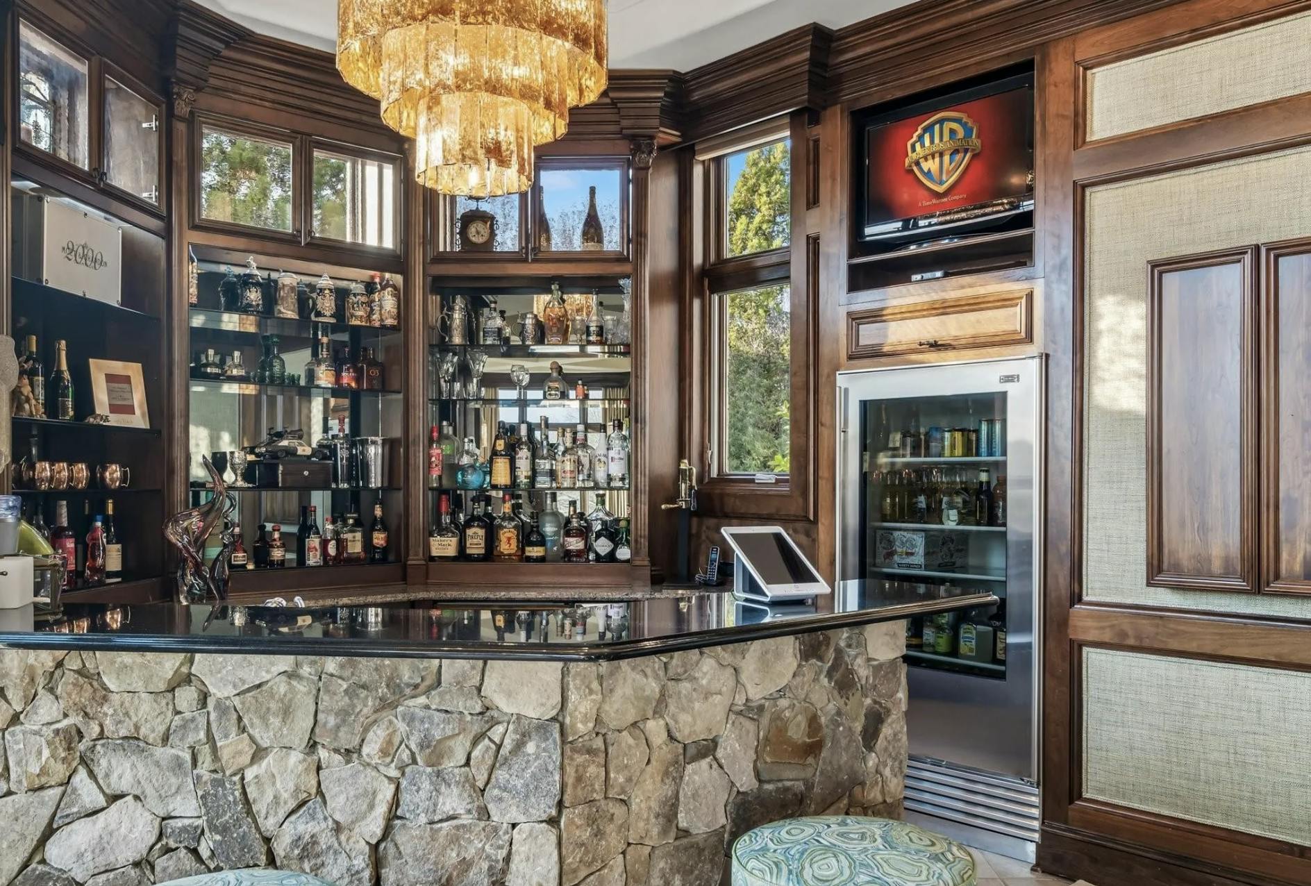 At over 12,000 square-feet, the six-bedroom, nine-bathroom luxury home features a gourmet kitchen – complete with a double oven and two dishwashers – as well as multiple rooms for lounging, a fully functioning bar, multiple workspaces, and intricate gold detail throughout.